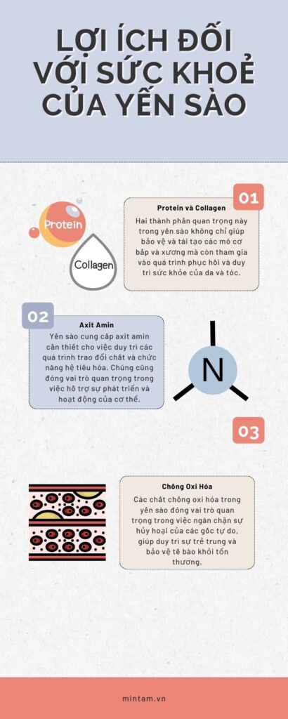 Protein và Collagen: Hai thành phần quan trọng này trong yến sào không chỉ giúp bảo vệ và tái tạo các mô cơ bắp và xương mà còn tham gia vào quá trình phục hồi và duy trì sức khỏe của da và tóc.